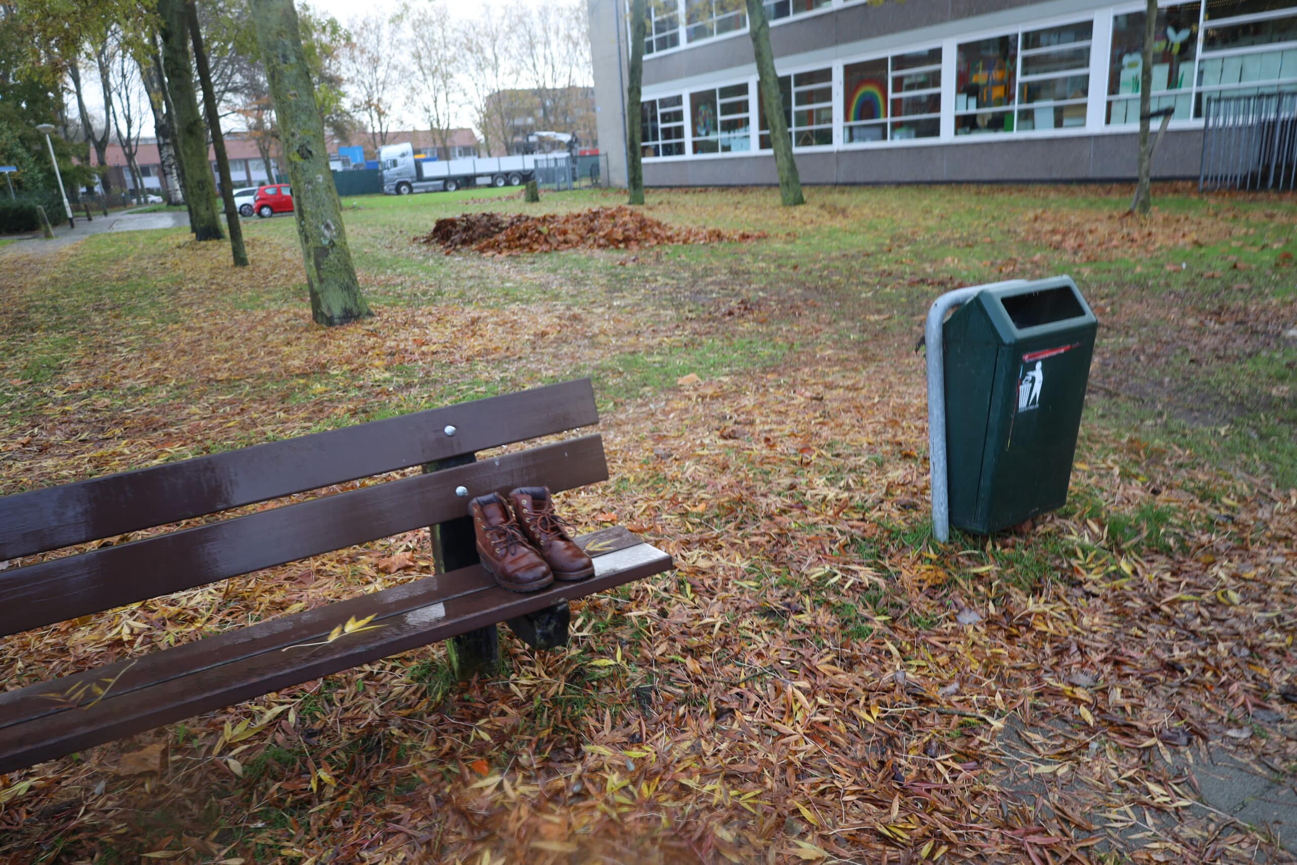 O’ja op het bankje bij onze school zagen we ook nog schoenen staan, van wie zouden die nou zijn?
